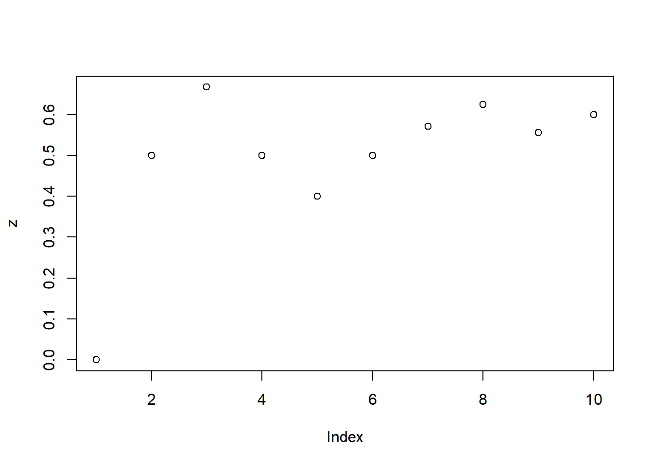 z [1] 0.0000000 0.5000000 0.6666667 0.5000000 0.4000000 0.5000000 0.5714286