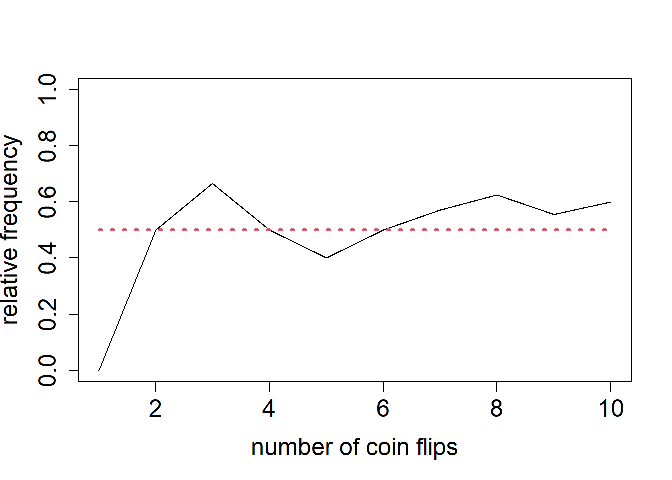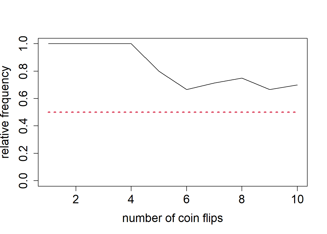 plot(1:length(z), z, type = "l", xlab = "number of coin flips", ylab = "relative frequency", ylim = c(0, 1), cex.lab = 1.5, cex.axis = 1.5)